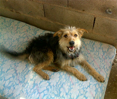 Pues bien Força ( fuerza en castellano) en apariencia estaba contenta y sonriente, no deja de hacerlo,pero no camina, o bien por desnutrición o por algun golpe ( heridas no tiene), no puede caminar, se arrastra y así iba la pobre por los matojos.Hay que desplazarla a brazos.